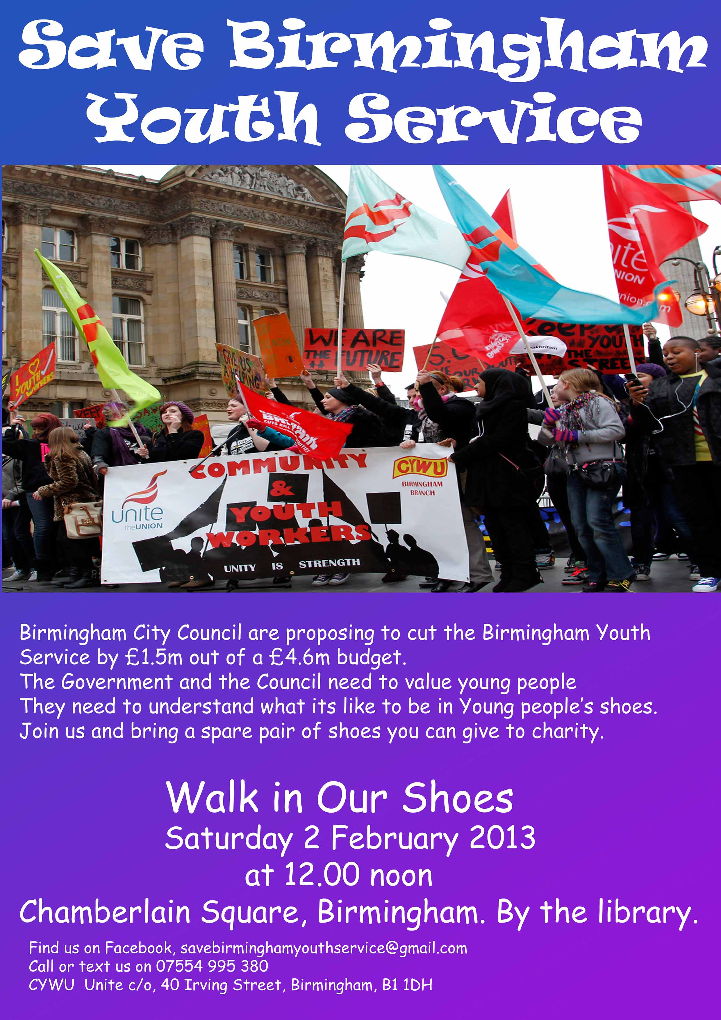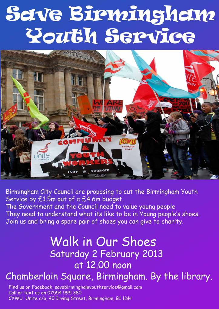 Another version of this poster publicising the ‘Walk in Our Shoes – Save Birmingham Youth Service Rally’ on Saturday, February 2 is to be found here. Many thanks to Maxine for enabling the above to be posted on this site.