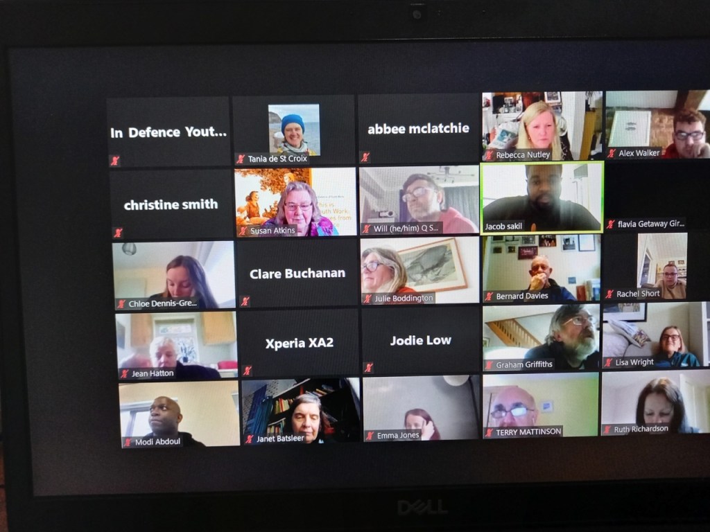 After a warm musical welcome from Bianca Todd (no, sadly she didn’t sing for us!), Sue Atkins got us going with a beautiful and rather poetic piece of writing on the ‘three sisters’: resistance, rebellion, revolution. Modi Abdoul introduced the remaining speakers, leaving valued space for quiet reflection between them – a refreshing touch in this time of Zoom overload. Janet Batsleer shared insights on resistance from the youth work citizen enquiry diaries project, invoking the resonant phrase, ‘Persistence is a form of resistance’. Jacob Sakil’s thought-provoking talk concerned resistance in relation to youth participation, drawing on his experience as a youth worker and as a young person involved in youth politics. Ruth Richardson from Institute for Youth Work challenged those present on the youth sector’s resistance to collaboration, asking if we can really claim that we work collaboratively as a youth work sector, and suggesting that (often) the answer is ‘no’… And we missed Tony Taylor, whose contribution was prevented by a power cut.