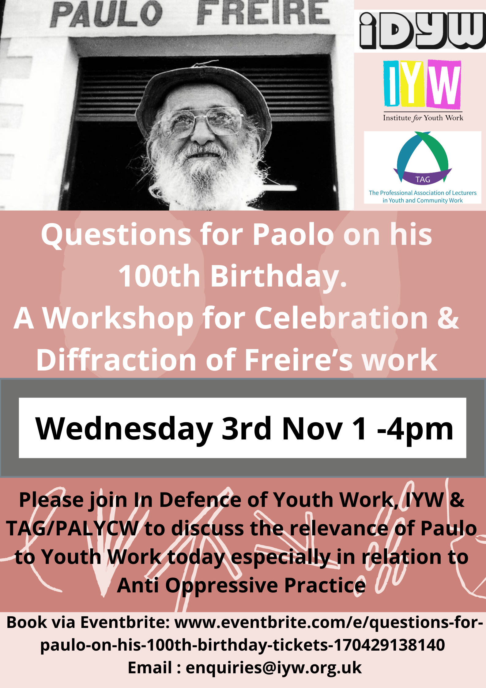Please join In Defence of Youth Work, Institute of Youth Work & TAG/PALYCW to discuss the relevance of Paulo to youth work today especially in relation to Anti-Oppressive Practice.